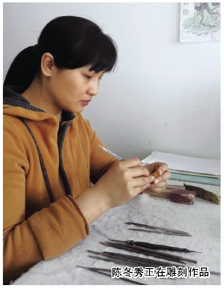 宝石加工及镶嵌工艺上的成功,并没有让陈冬秀迷失自我。她深知自己文化底子薄,艺术功底弱,要登上艺术高峰,更需“人一我十、滴水穿石”的精神。多年来,她无所不学,学无常师。她广泛涉猎文化典籍,虚心求教于各地书画雕刻名家,并多次进入福建师范大学美术学院参加省级石雕研习班学习。