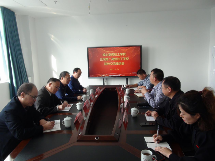 10月26日下午,闽北高级技工学校校长刘则兴一行到我校进行参观交流。校长徐思明、副校长章鹏飞、陈昌初、曾强及办公室负责人参加座谈会。