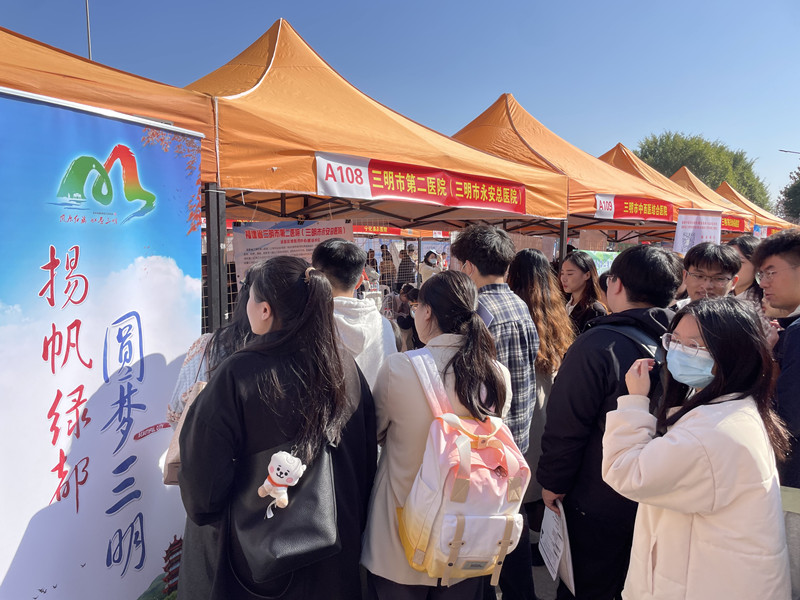 来自三明市的医疗卫生企事业单位招聘摊位在校园图书馆前广场集中成排展开,吸引了众多福建中医药大学和周边高校毕业生。几百份制作精致的“三明市主要人才政策(医疗篇)”宣传册被争相领取一空,毕业生排成队或三五成群围在摊位前咨询、登记、投送简历,明媚的阳光为招聘会送来冬日的温暖。
