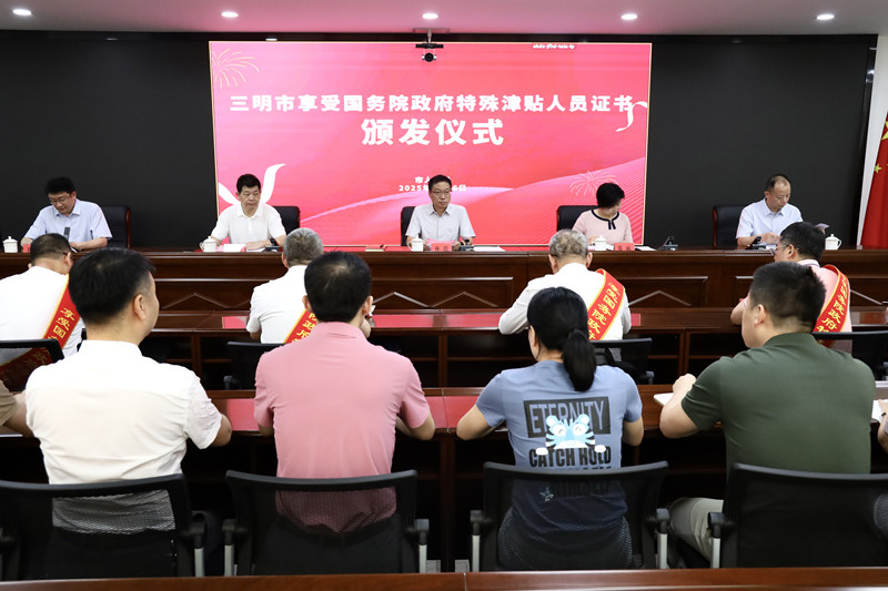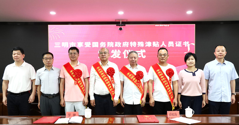 5月16日,我市举行享受国务院政府特殊津贴人员证书颁发仪式,现场向郭尚接、罗翀、洪宜聪、薛松海等4名2023-2024年享受政府特殊津贴人员颁发荣誉证书。市人社局党组书记、局长林蔚出席仪式并讲话,福建省三明第一中学罗翀作代表发言。