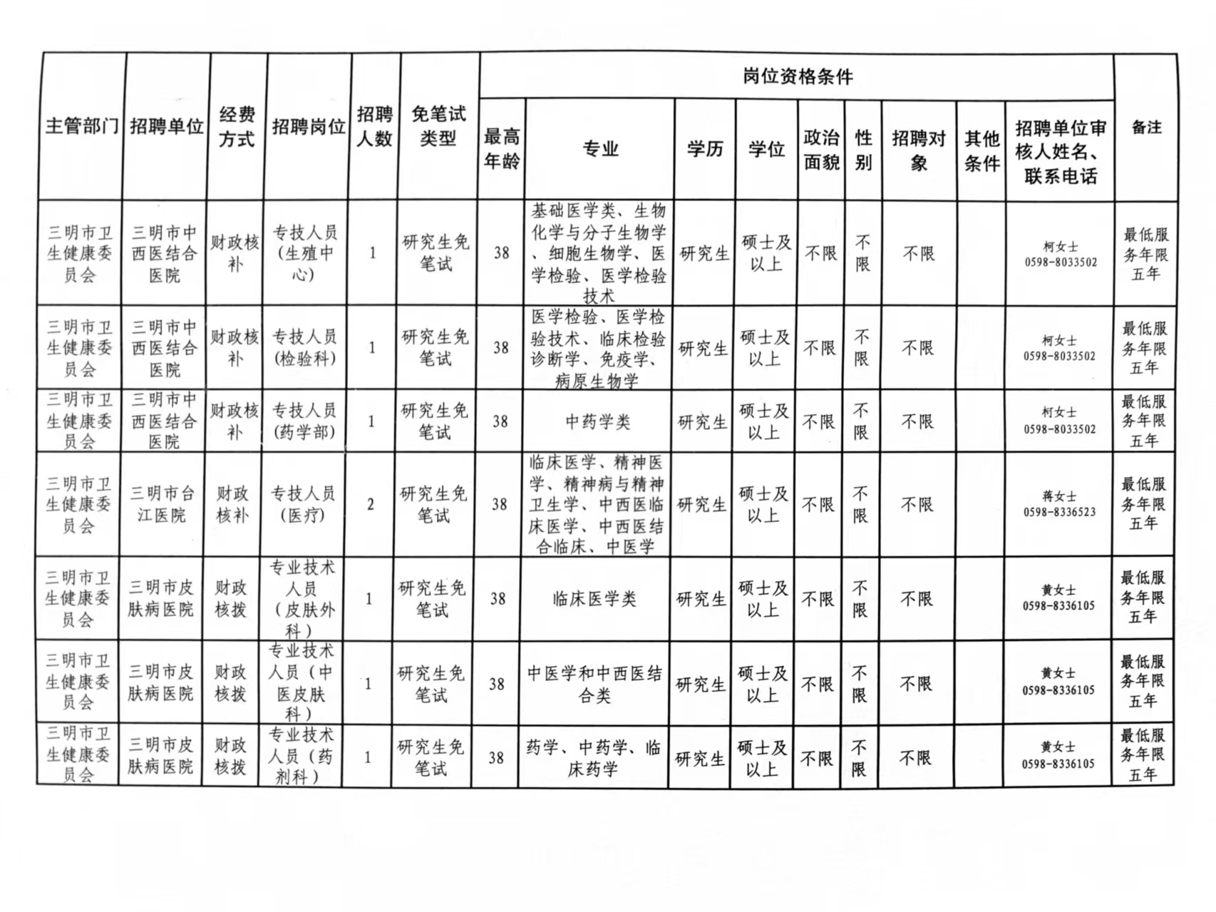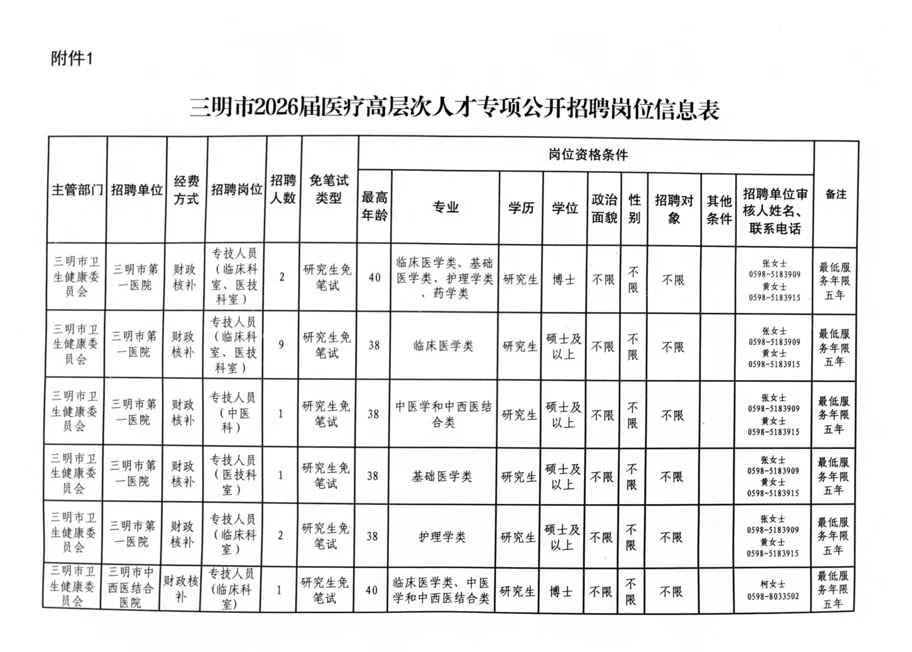 附件:1.三明市2026届医疗高层次人才专项公开招聘岗位信息表